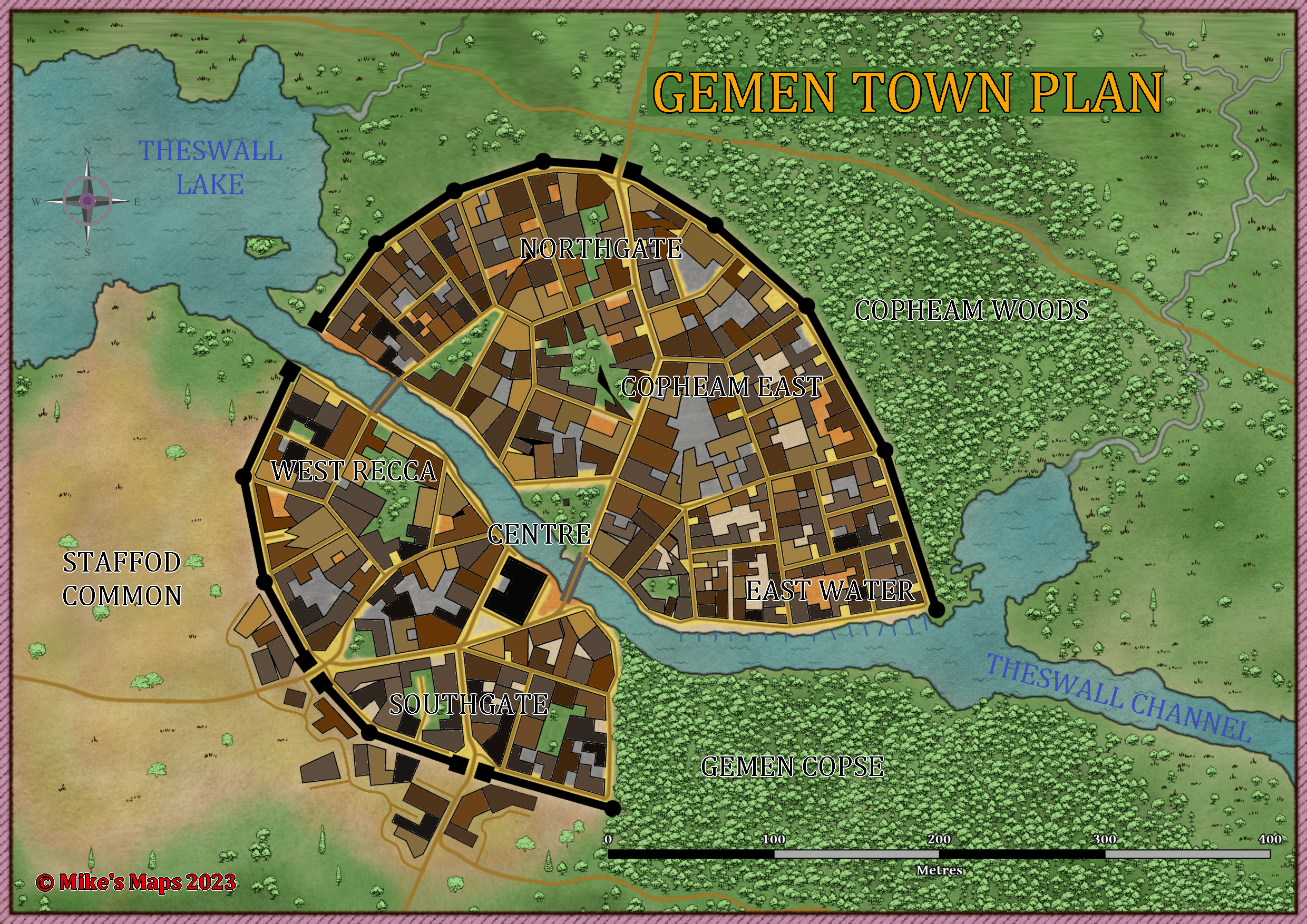 Own project (composite - part handrawn, part software). Local plan of a walled town. 2840 x 1754 pixels.