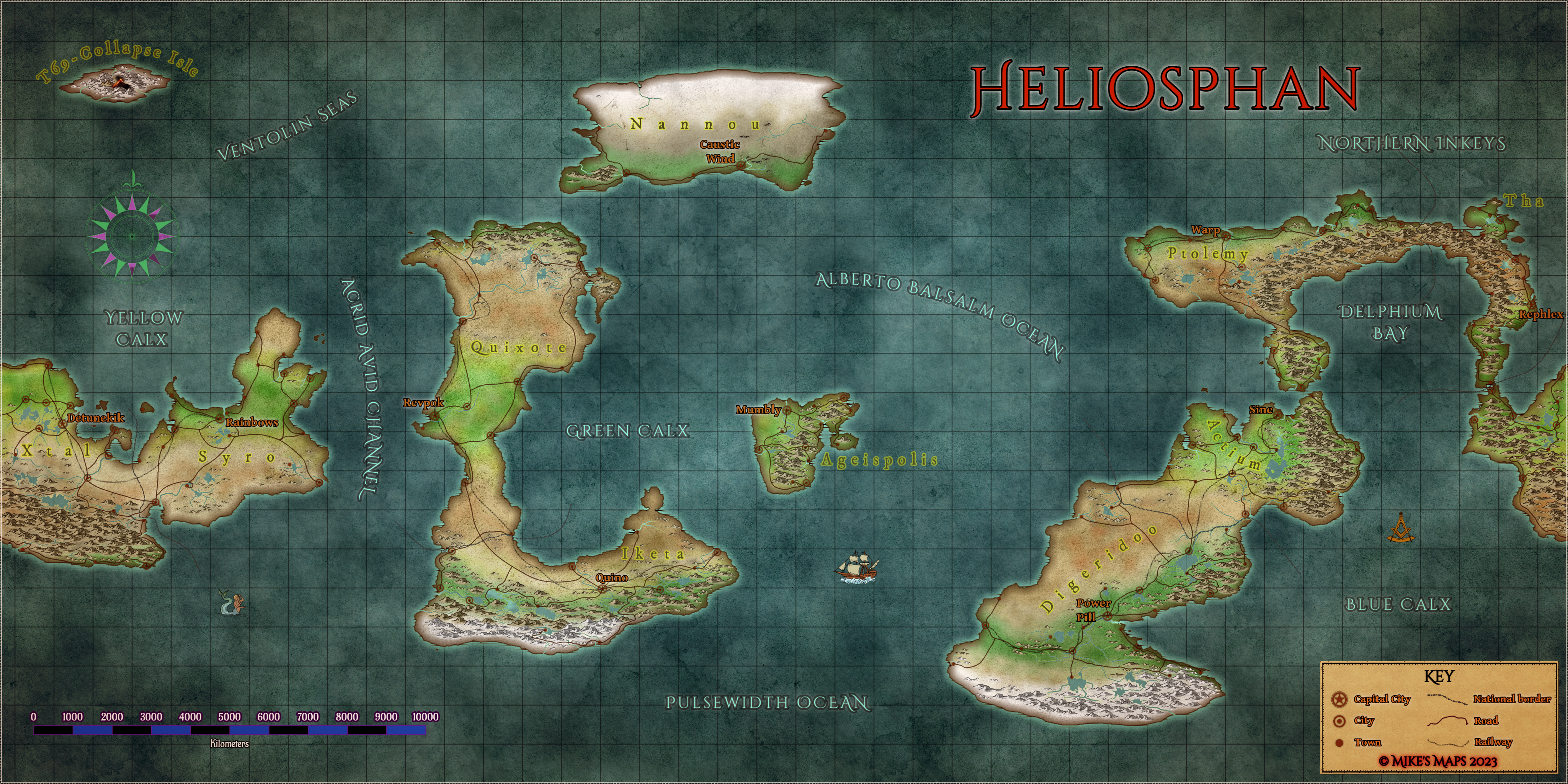 Commissioned by J. E. Flint. World map of a magical world - for a future webcomic. 7700 x 4700 pixels.