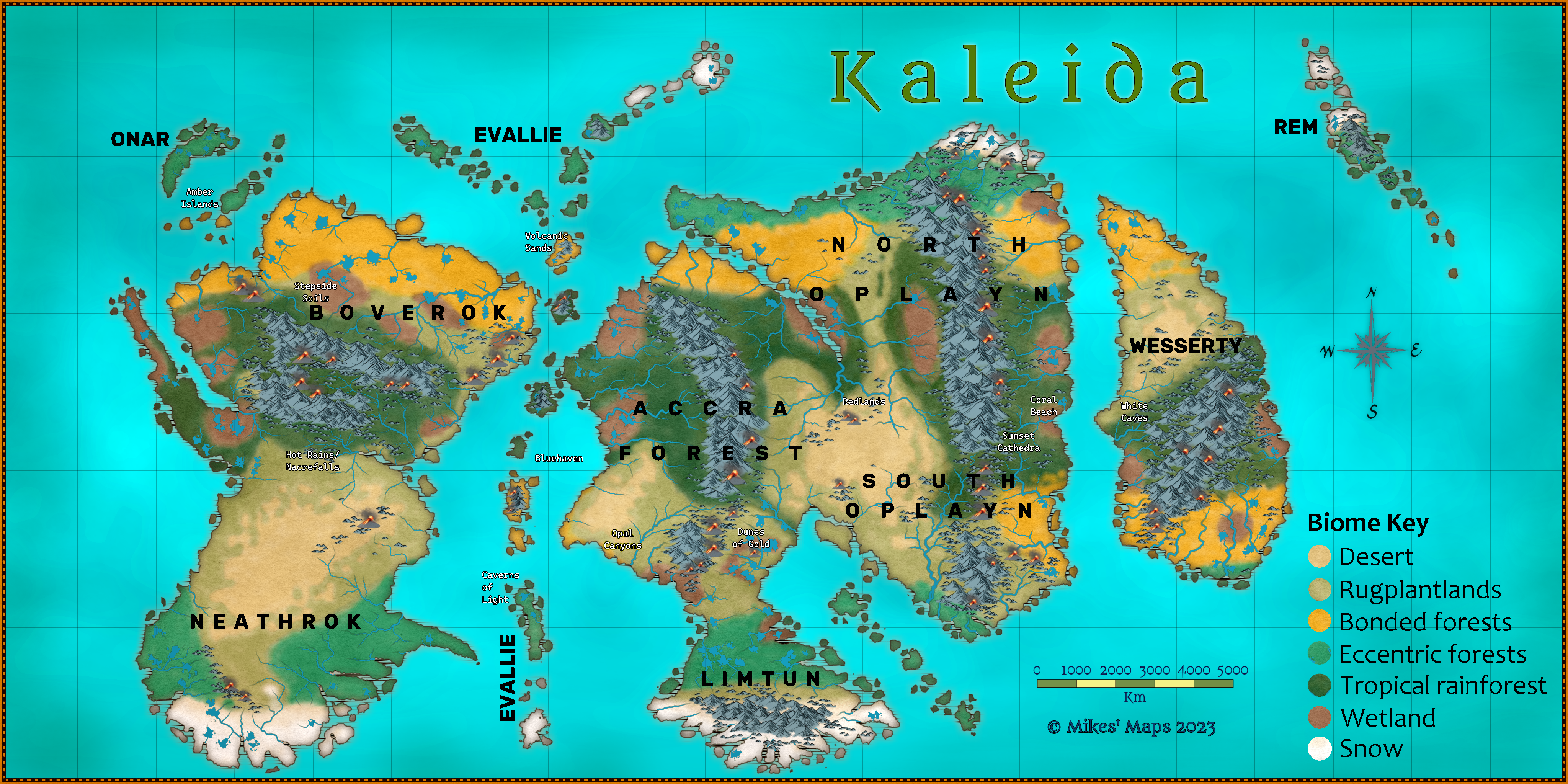 Commissioned by The Character Consultancy. Biome world map of Kaleida, with continent names. Kaleida is an ongoing worldbuilding project of an unspoilt fantasy planet, showcasing the level of worldbuilding detail TCC is able to achieve. Let TCC know if you have any worldbuilding to work on! 4096 x 2048 pixels.