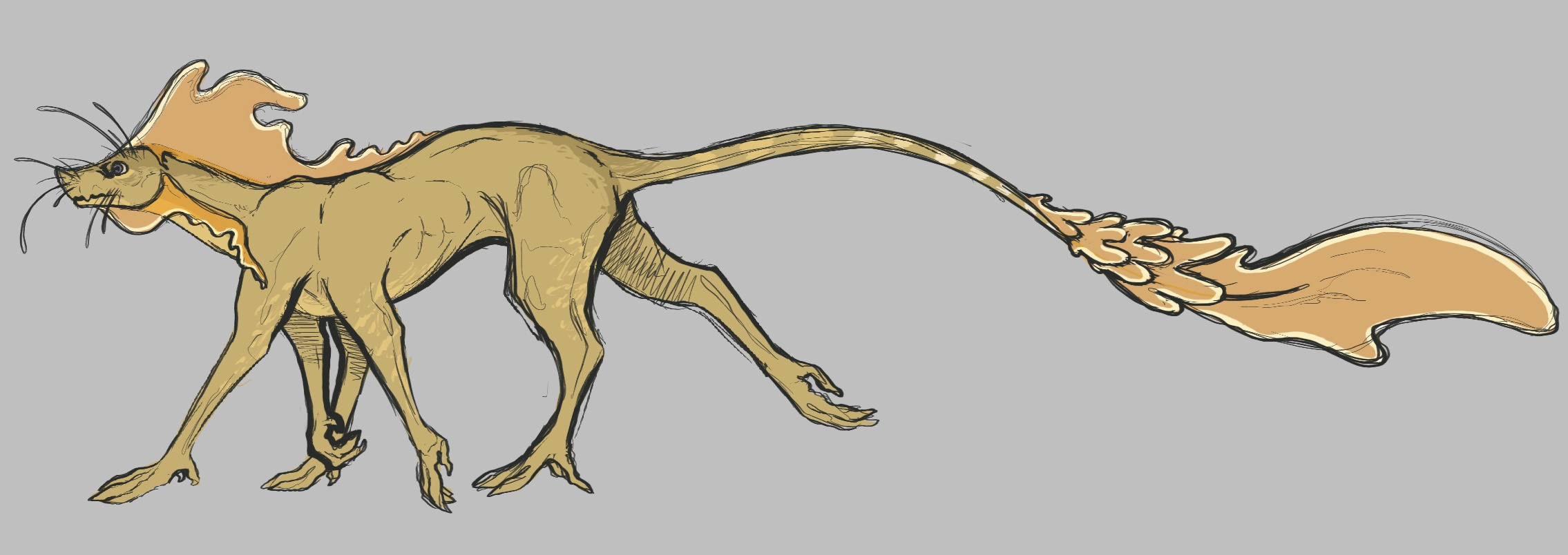 One of the Oplayn tropics' apex predators, who are in the process of uplifting to become a sapient species. Pinno' grath typically hunt in pairs, which allows younger individuals to learn from their more experienced elders. Their relationship with the mukash and kasulam is complex, as historically, the pinno' grath used to be one of their main predators, but they have mostly transcended this role. In drier areas they regularly visit mukash-kasulam burrows for water. See more detail in their lore bible about this.