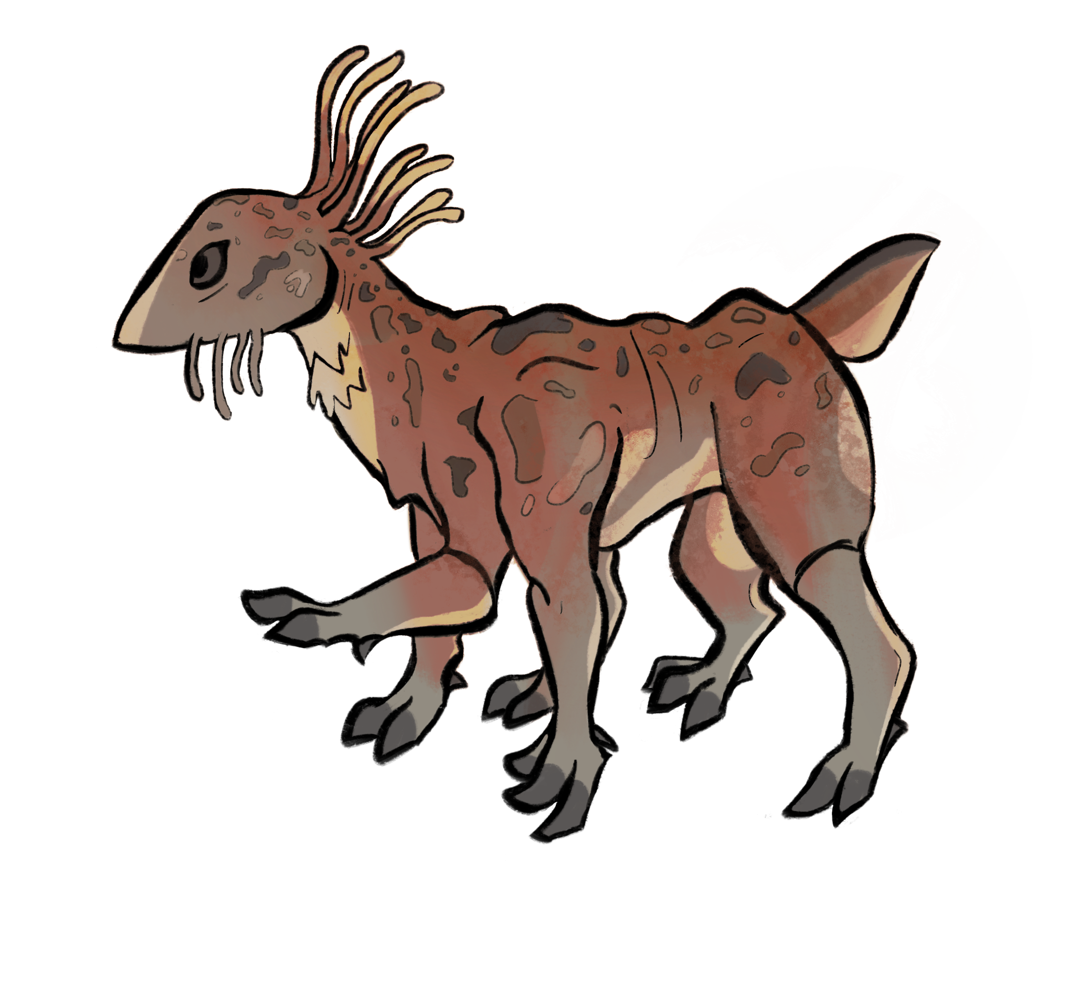 The mukash evolved in tandem with the kasulam, and share their burrows and many customs with them. The two share an enduring bond, as kasulam have dexterous hands while the mukash have hooves, which makes certain tasks impossible for them. In return, the mukash are naturally vigilant against predators, which the kasulam tend not to be.