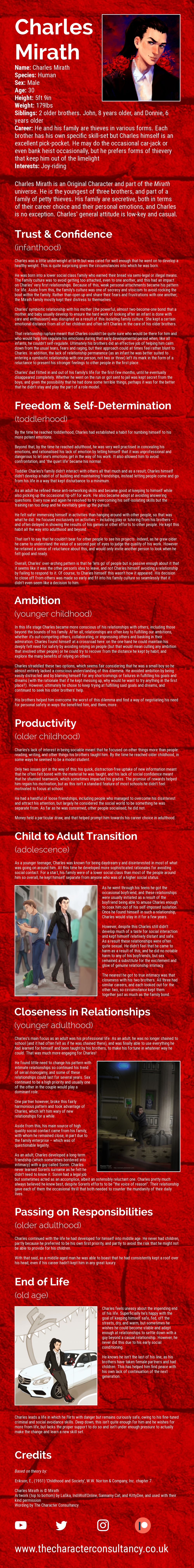 Writing characters from cradle to grave is my speciality! I offer these at three levels: written only (called a No Frills), as an infographic, and as a narrated video. Click the below links to see examples of each.