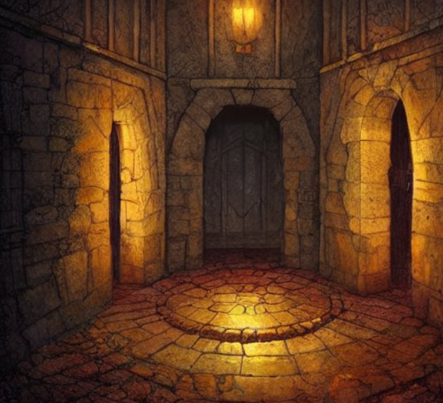 You enter into an empty, peaceful room with a cosy ambiance on account of the amber-coloured light that comes from you-can't-tell-where. A low, round dais graces the centre of the room but appears to have no true function. More importantly, three exits beckon you. Each has a symbol above it.
