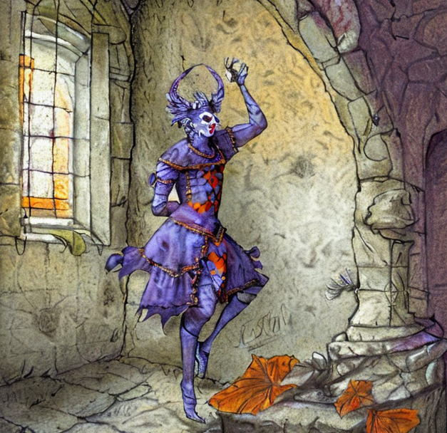 He skids to a stop and you take a moment to look at him. His outfit is purple-themed with orange accents and short skirts that are still swishing from his arrival, and his hair is styled into a pair of horns; in this medieval place you can't even imagine what he's used for gel. He is small and slight in stature with narrow shoulders and dainty hands and feet. He wears a white mask but you believe his ethnicity to be middle-Eastern. His voice is a light tenor and he's brimming with enthusiasm and joy.