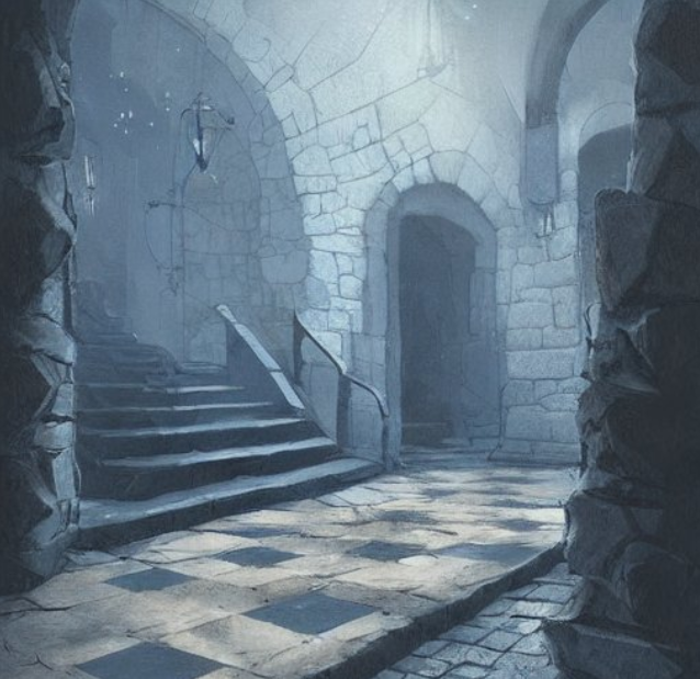 The next room is cool and silent. Its floor is paved with flagstones, some light, a few dark. At the centre of the room is a pale, shapeless blob that you cannot identify but you suspect might be a discarded cloak or some sort of large fungus.