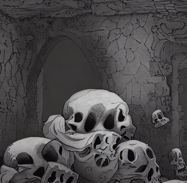 If you step on one you summon a second skull, which rises out of the lump and joins the other one in its pursuit of you. If that happens, roll twice. From here on, every dice roll costs you one level of your Life Force clock. If you get 1-5 both times, you may leave via the Continue link below. For every 6 you get, another skull appears and chases you. If you get 3 skulls in the room, they block your path and you cannot leave, and your quest ends here.