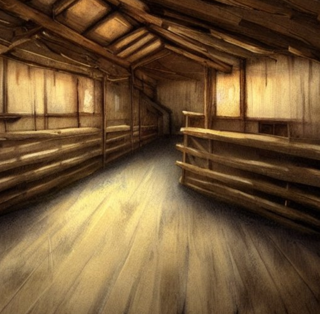 You enter a humble yet sturdily-made wooden barn. The moment you enter, the scent of farmyards hits you and you look around for livestock.