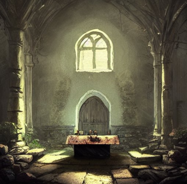 You emerge into a space that feels vaguely like a chapel. Perhaps it was once a place of worship, but now it feels quite deserted. That is, all except for the table at the centre of the room which is incongruously well-laden. You approach. On the table there is: