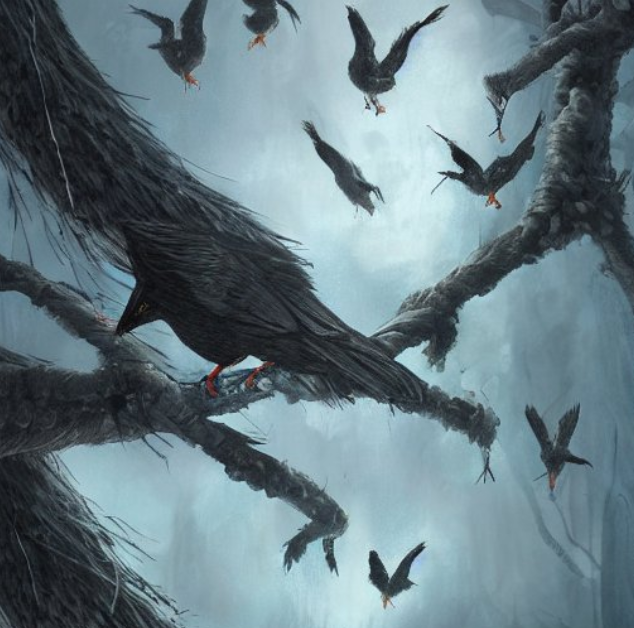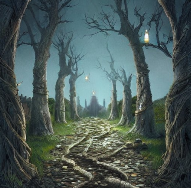 The moment you step outdoors you hear the rough voices of birds, dozens of them. Feathers, bird spoor, and broken eggshells litter the ground. Ahead of you is a long, straight path lined with trees, leading to a building which you believe you must reach. All of the trees appear to be dead, and are heavy with nests. The pathway hasn't been maintained in quite some time, and the tree roots have made the already bumpy cobblestones even more treacherous. Not a good surface to run on.